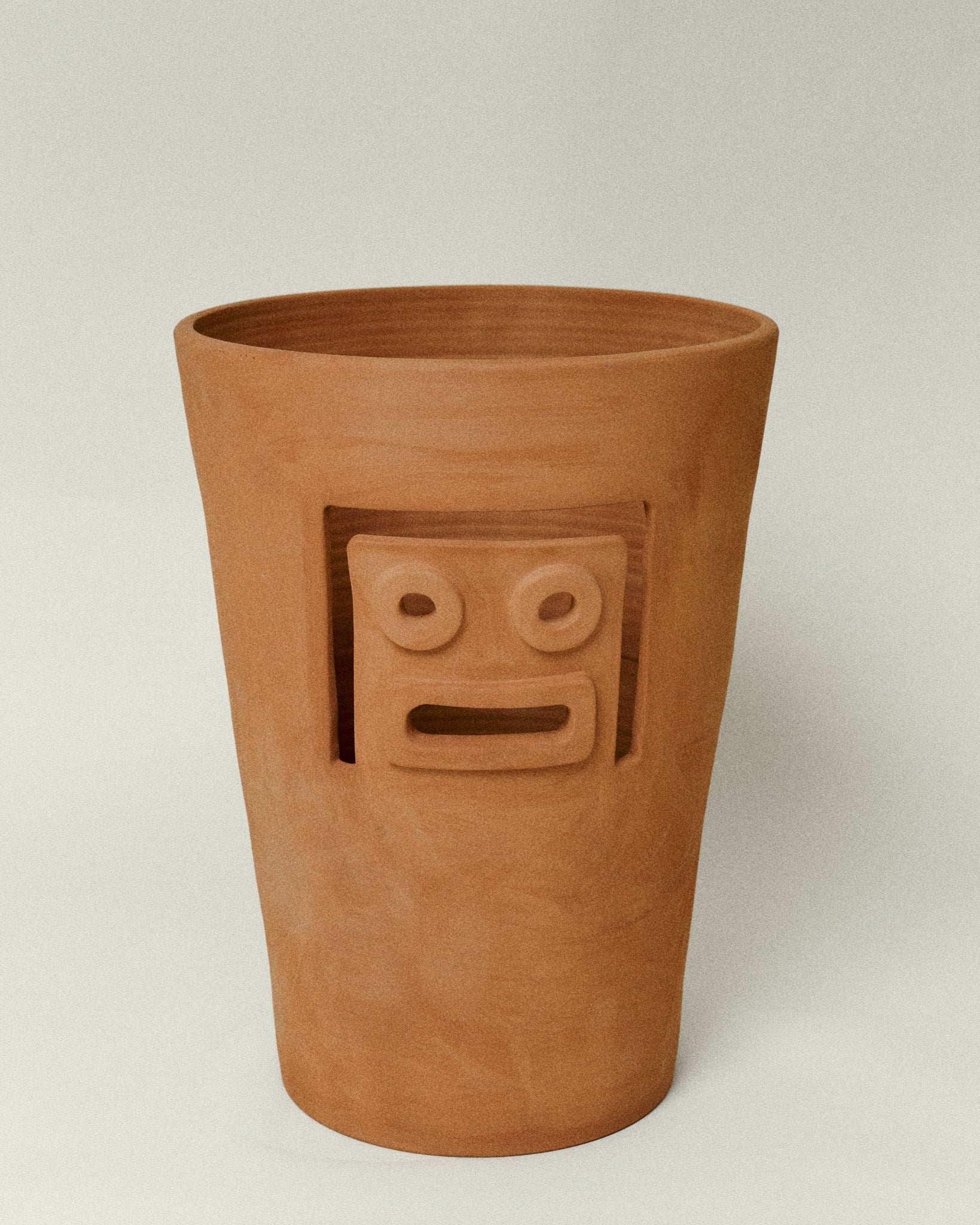 Large-scale handcrafted planter with clean lines and sculptural presence. Designed to accompany larger plants in indoor and outdoor spaces. Available in terracotta.